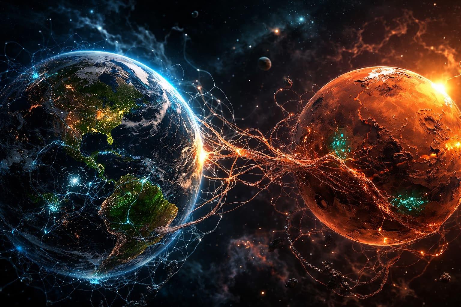 Illustrazione creata con l'IA di fulmini nell'atmosfera marziana osservati da MAVEN.